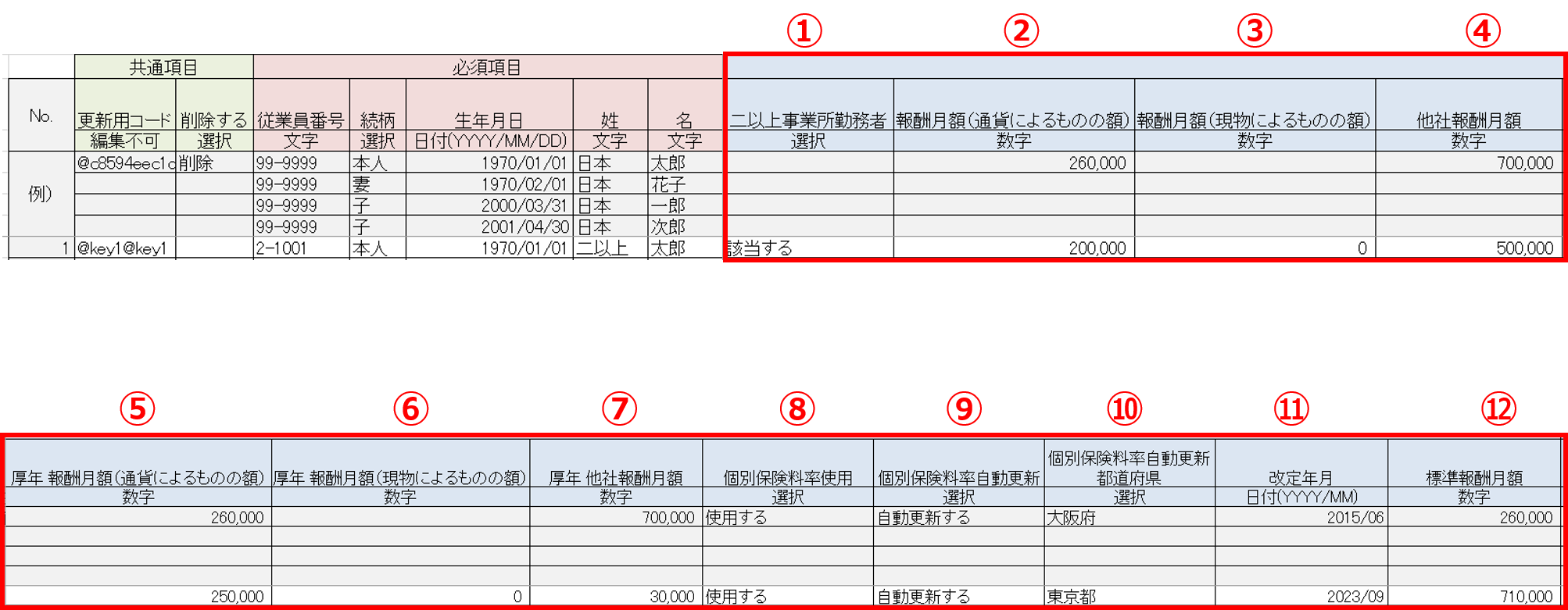 ダウンロードしたテンプレートファイルに、二以上事業所勤務者としての情報を編集します。