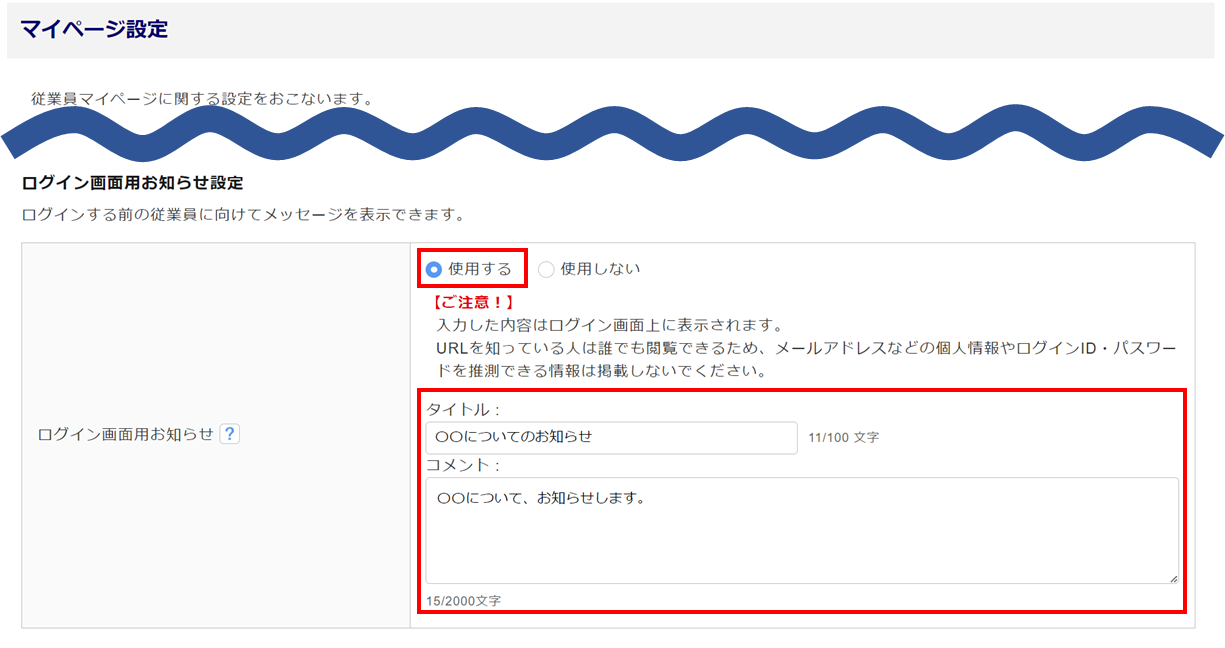 従業員マイページのURLを知っている人は誰でも閲覧できる情報となるため、メールアドレスなどの個人情報やログインID・PWを推測できる情報は掲載しないでください。