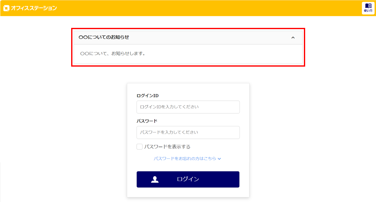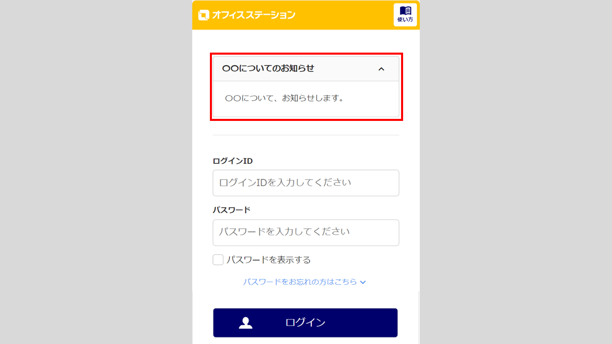 従業員マイページのログイン画面に、従業員へ向けて企業独自のお知らせを掲載することができます。