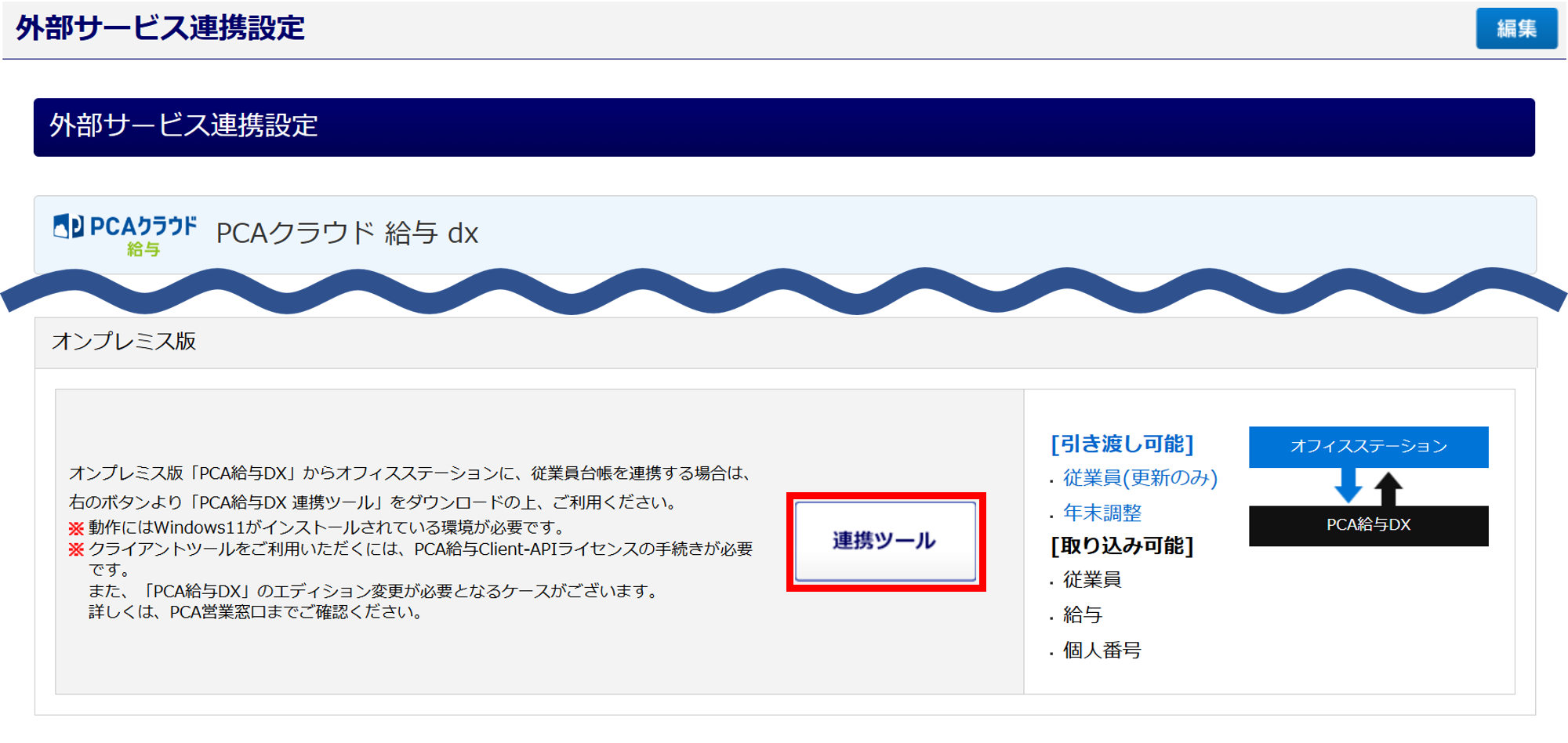 PCA給与オンプレミス版とオフィスステーションのデータ連携をおこなう際は、連携ツールを利用します。
