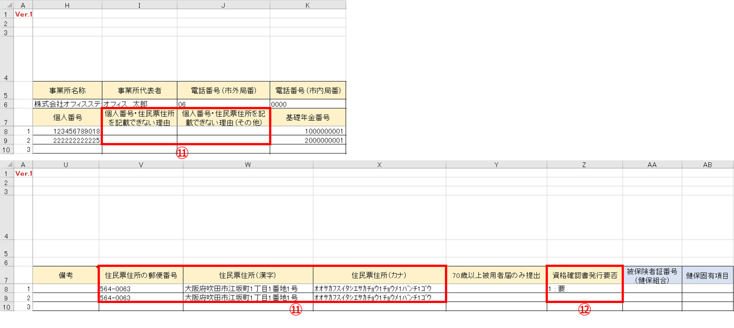 | ⑪ | 個人番号・住民票住所を記載できない理由 | 個人番号を設定できない場合かつ住民票住所を設定できない場合は、理由に対応する数字を選択します。 1:海外赴任 2:短期在留 3:その他 |