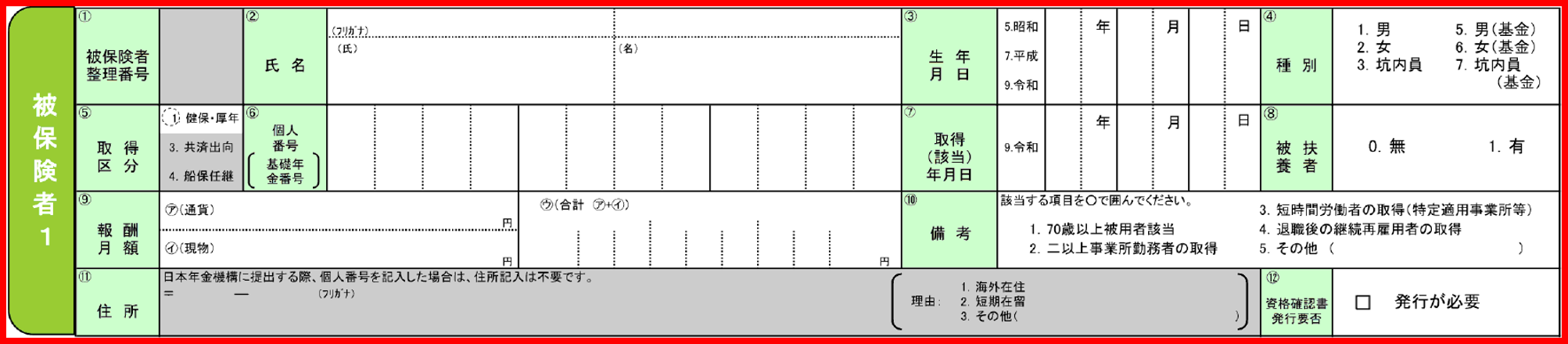 | 備考 | 以下のような事例に該当する場合、入力します。該当しない場合は入力不要です。 (1) 健康保険法第 118 条第1項各号のいずれかに該当する人については、その旨を入力 (2) 資格取得時までに引き続いて厚生年金保険の第四種被保険者であった人は、その旨 として管轄していた年金事務所名を入力 |