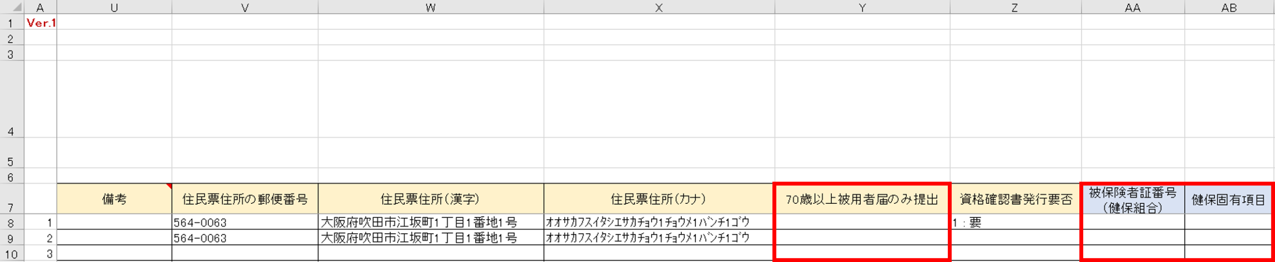 「個人番号」の入力がある場合、「住民票住所の郵便番号」「住民票住所(漢字)」「住民票住所(カナ)」が入力されている状態でもCSVファイルへの変換時に削除されます。