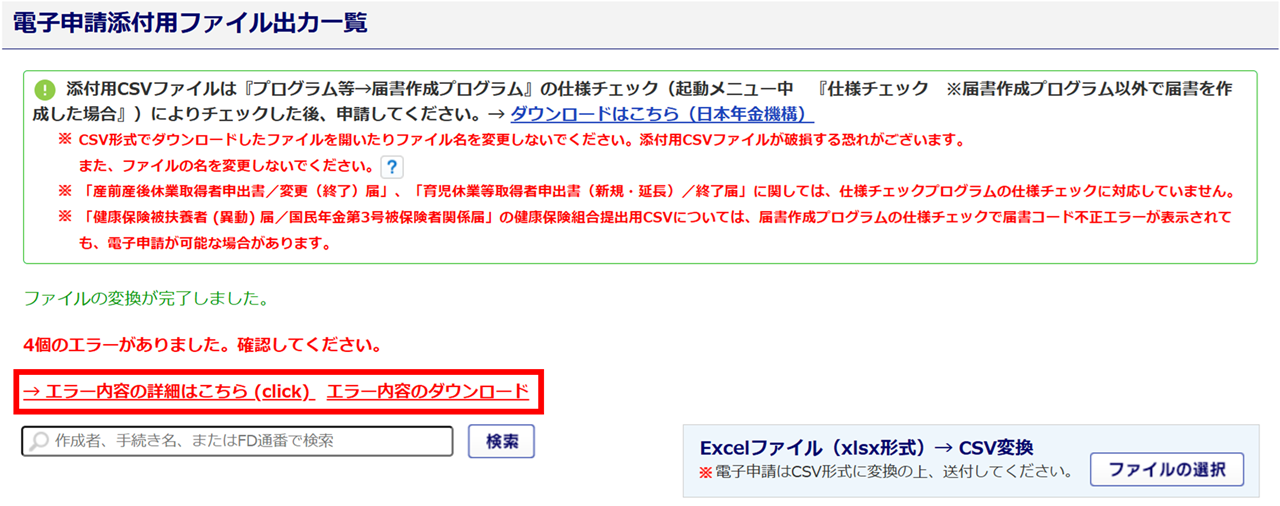 CSVファイルの作成が完了後、日本年金機構が提供している「届書作成プログラム」の仕様チェックをおこなうことをお勧めしております。操作方法は、以下の関連記事をご参照ください。