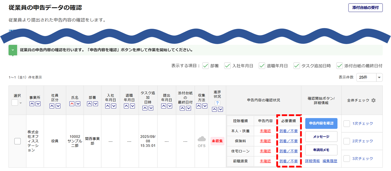 本画面は従業員の回答状況を随時更新しております。そのため、「未収集」の状態であっても、必要書類の確認状況が「到着/不要」に変更されることがあります。