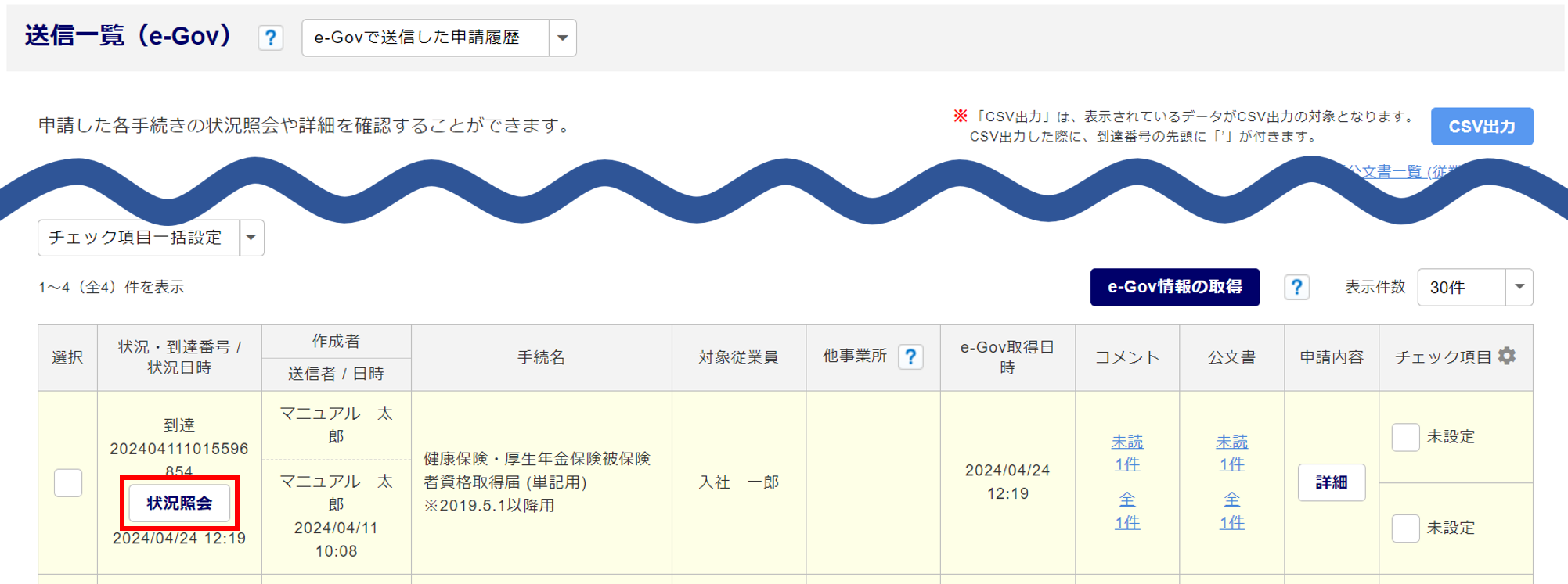 該当手続きの[状況照会]をクリックします。
