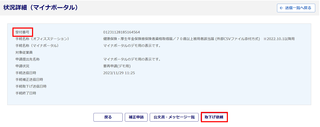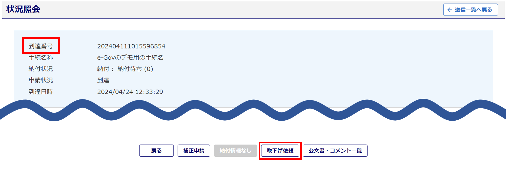 ※[取下げ依頼]ボタンが利用できない場合には、「到達番号」を控えていただき提出機関へお問い合わせください。