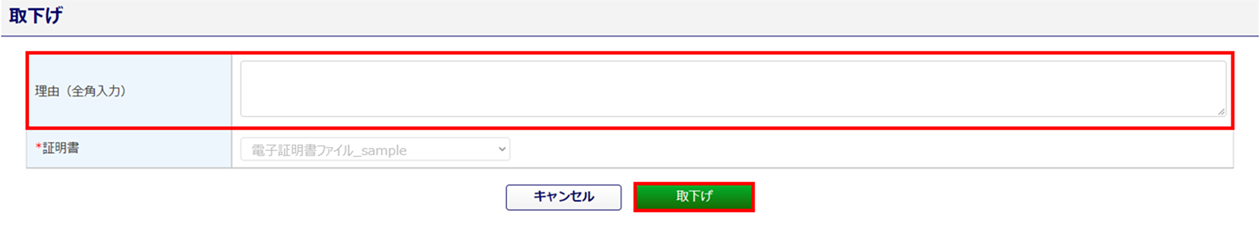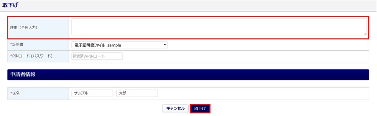 「理由(全角入力)」を入力し、[取下げ]をクリックします。