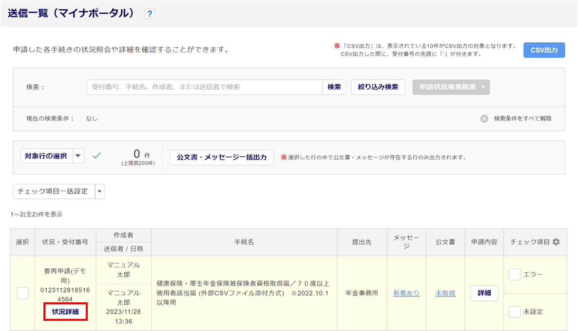 ※[状況照会]ボタンが表示されていない場合は、提出機関へ直接お問い合わせください。