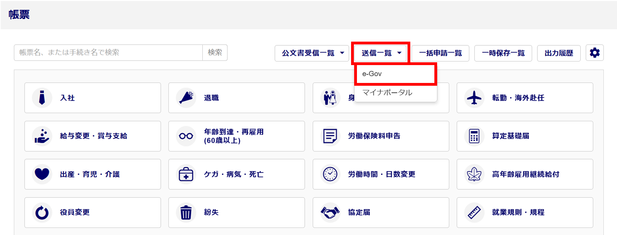 [送信一覧]>[e-Gov]をクリックします。
