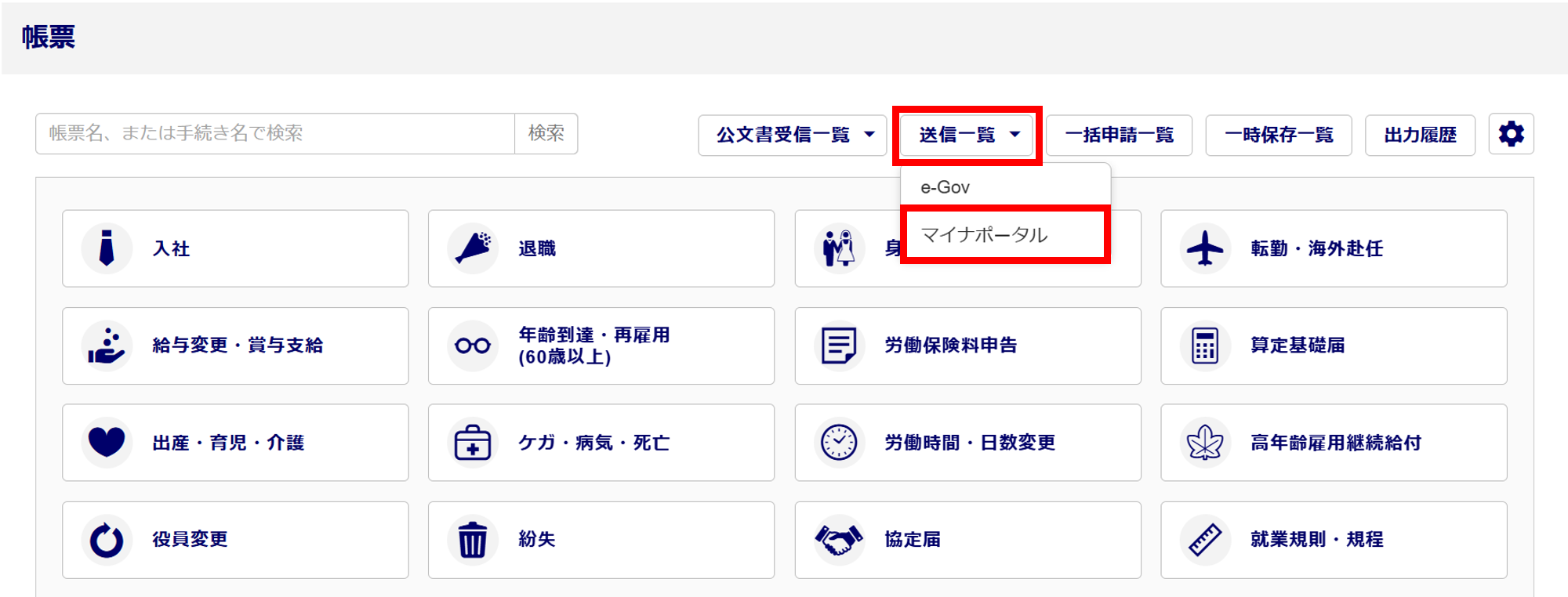 [送信一覧]>[マイナポータル]をクリックします。