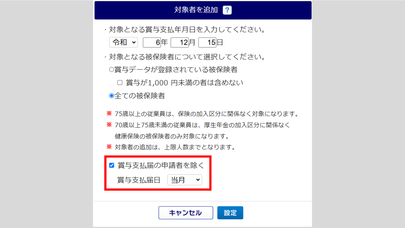 入力した「賞与支払年月日」時点で被保険者である場合に、対象者として追加されます。
