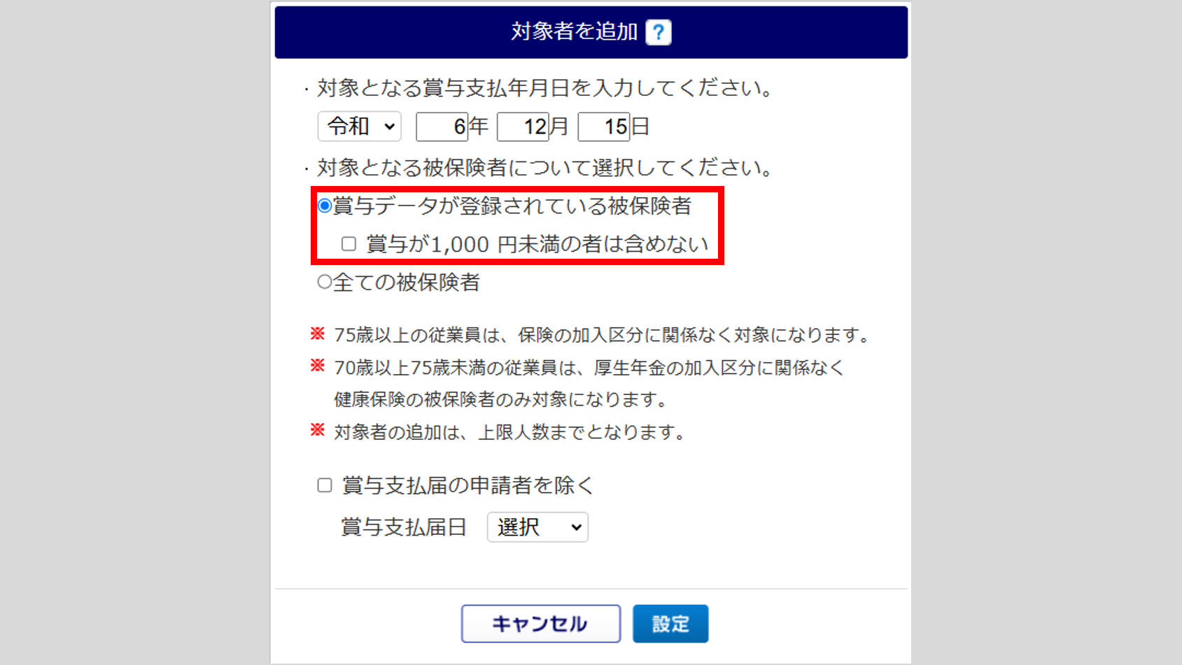 - 「賞与データが登録されている被保険者」を選択した場合