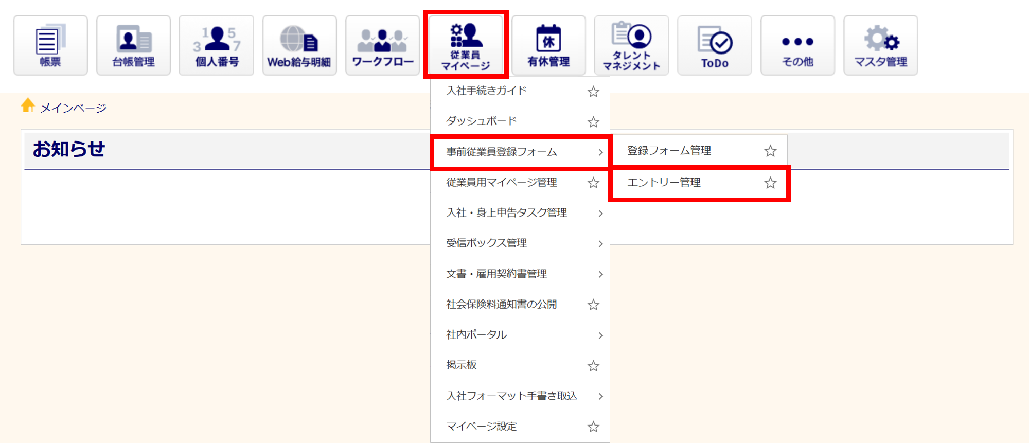 [従業員マイページ]>[事前従業員登録フォーム]>[エントリー管理]をクリックします。