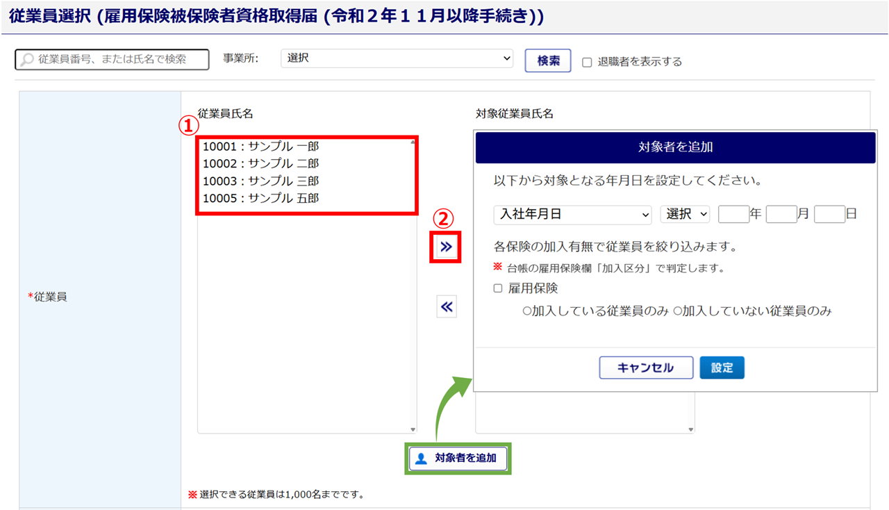 [対象者を追加]をクリックすると、設定した条件と従業員台帳の「入社年月日」「雇用保険 資格取得年月日」「雇用保険 加入区分」の情報をもとに対象者を自動で選択します(条件を満たす対象者が「対象従業員氏名」欄に移動)。