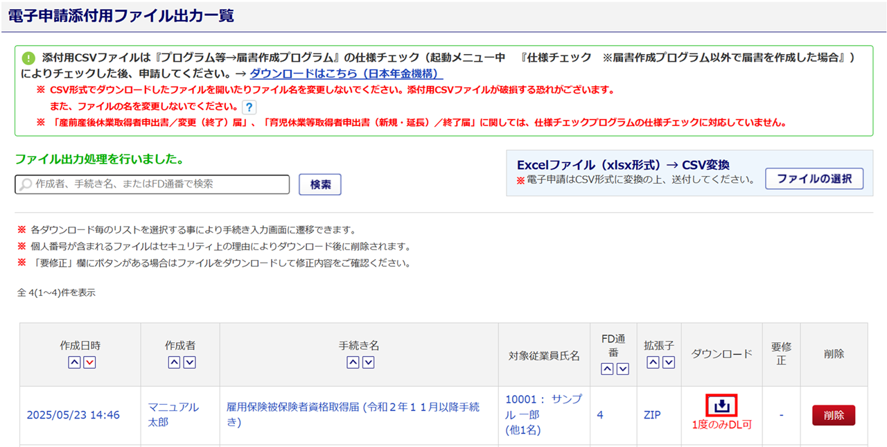 作成したCSVファイルの電子申請方法は、以下の関連記事内「ダウンロード一覧からの申請」をご参照ください。