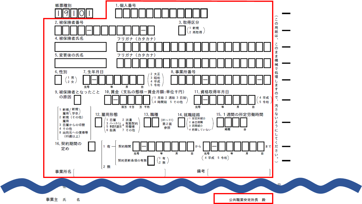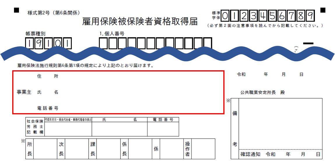 | ③ | 取得区分 | 初めて雇用保険に加入もしくは前職から7年以上経過している場合は、「1:新規」を選択します。 前職で雇用保険に加入していた場合は、「2:再取得」を選択します。 |