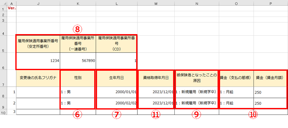 | ⑨ | 被保険者となったことの原因 | 被保険者となったことの原因を選択します。 1:新規雇用(新規学卒) 4:その他 2:新規雇用(その他) 8:出向元への復帰(65歳以上) 3:日雇からの切替 |