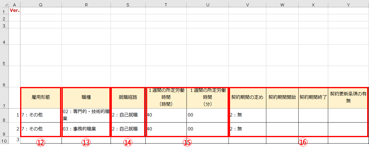 | ⑭ | 就職経路 | 該当する就職経路を選択します。 1:安定所紹介 2:自己就職 3:民間紹介 4:把握していない |