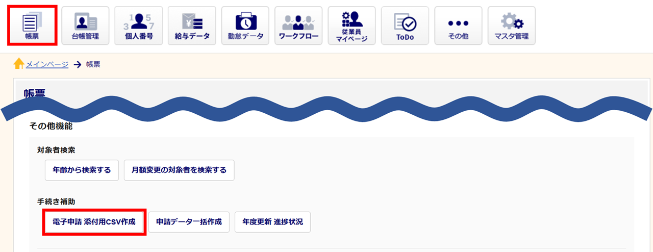 [帳票]>[電子申請 添付用CSV作成]をクリックします。