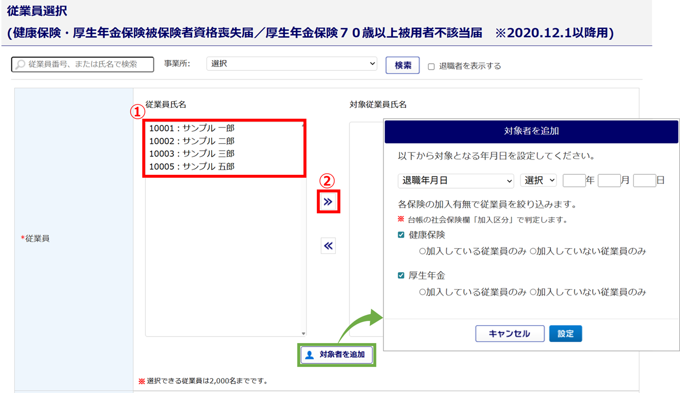 [対象者を追加]をクリックすると、設定した条件と従業員台帳の「退職年月日」「健康保険 資格喪失年月日」「厚生年金 資格喪失年月日」「健康保険 加入区分」「厚生年金 加入区分」の情報をもとに対象従業員を自動で選択します(条件を満たす対象者が「対象従業員氏名」欄に移動)。