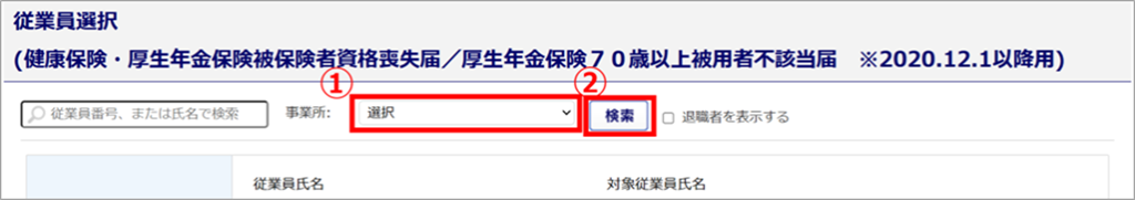 事業所で従業員情報を絞り込む場合は、「選択」()にて事業所を選択し、[検索]()をクリックします。