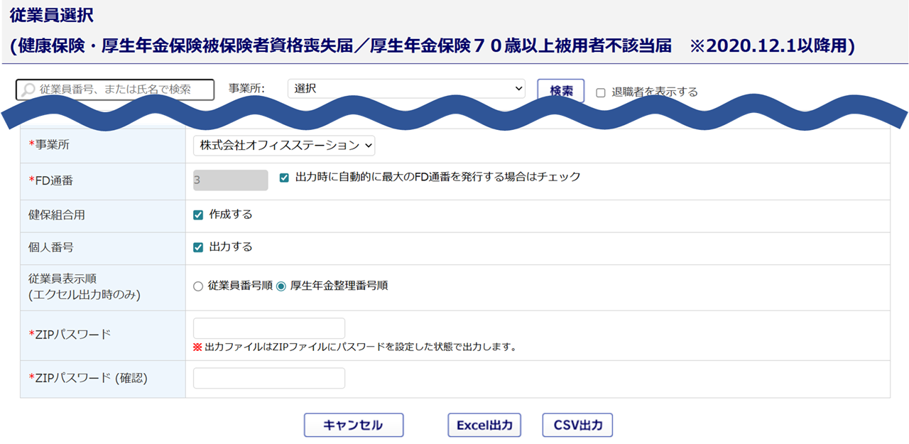 「健康保険・厚生年金保険被保険者資格喪失届/70歳以上被用者不該当届 (外部CSVファイル添付方式)」の手続き時に添付するCSVファイルをオフィスステーションにて作成する方法について、ご説明します。