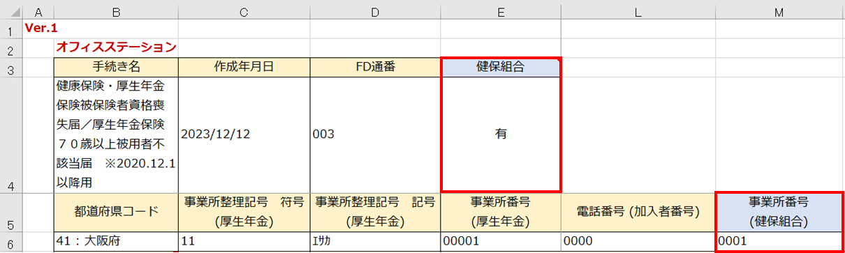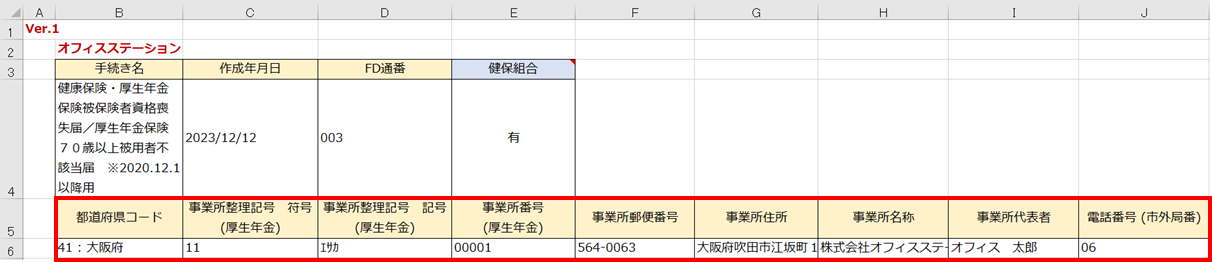 事業所情報は、5,6行目に反映されています。