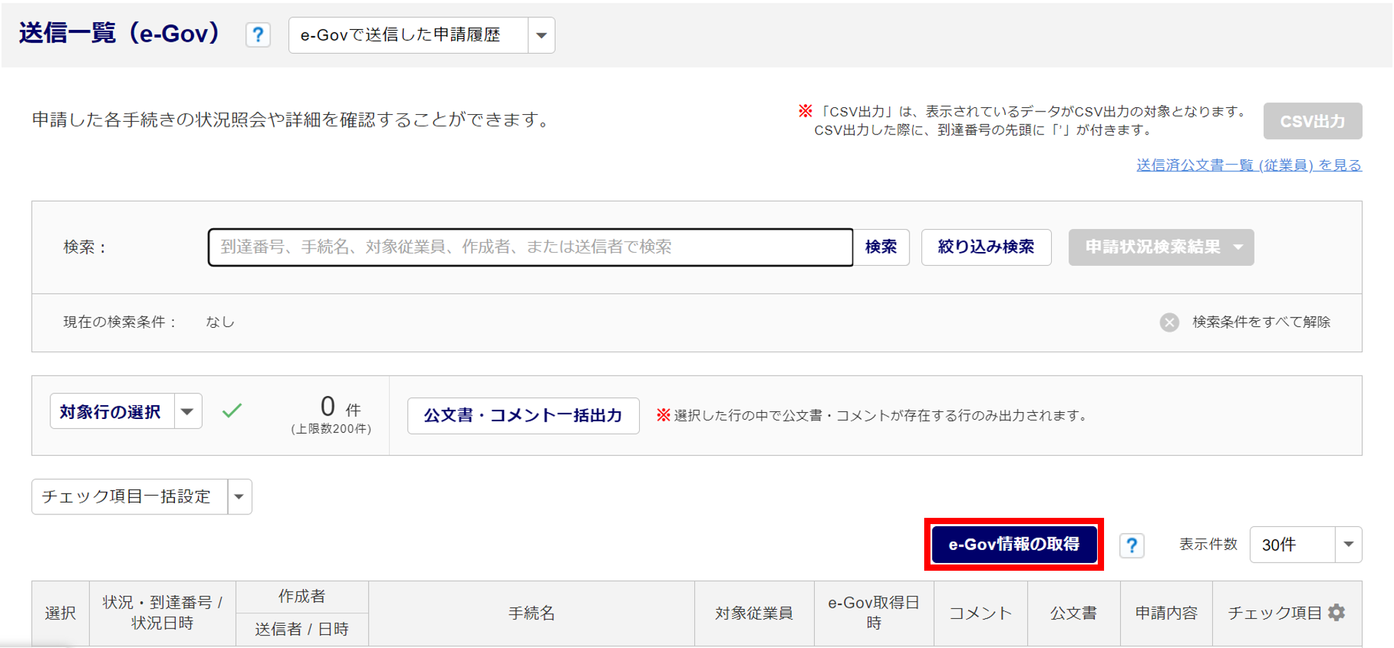 「送信一覧(e-Gov)」画面の「状況」や、「公文書 / コメント」など、最新の情報に更新されていない場合、手動で情報を更新する必要があります。