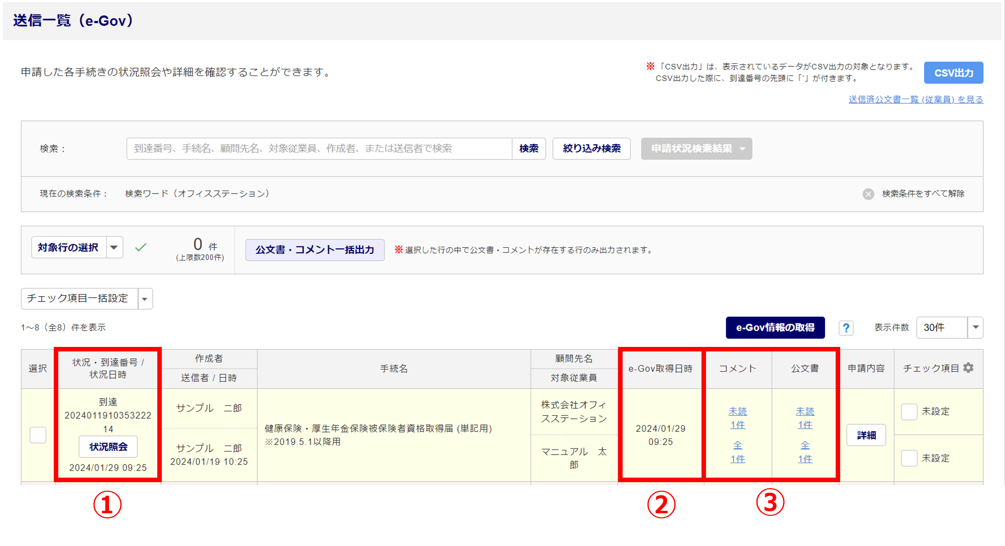 「送信一覧(e-Gov)」情報更新操作をおこなった場合、①~③の情報が更新されます。