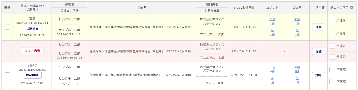 | ピンク | e-Govおよび提出機関へ到達する前にエラーとなっている状況 ※エラーの原因は[エラー内容]から確認でき、[詳細]から削除できます。 |