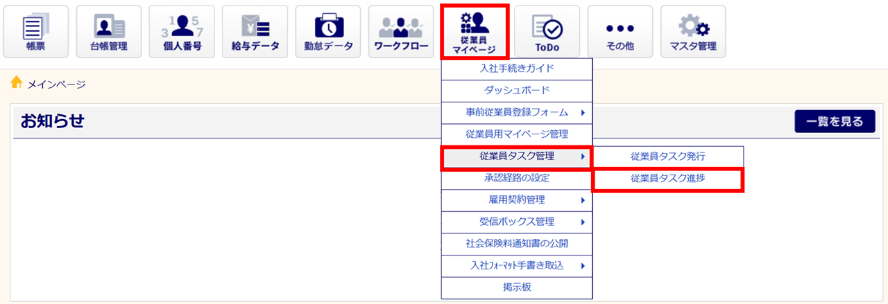 [従業員マイページ]>[従業員タスク管理]>[従業員タスク進捗]をクリックします。