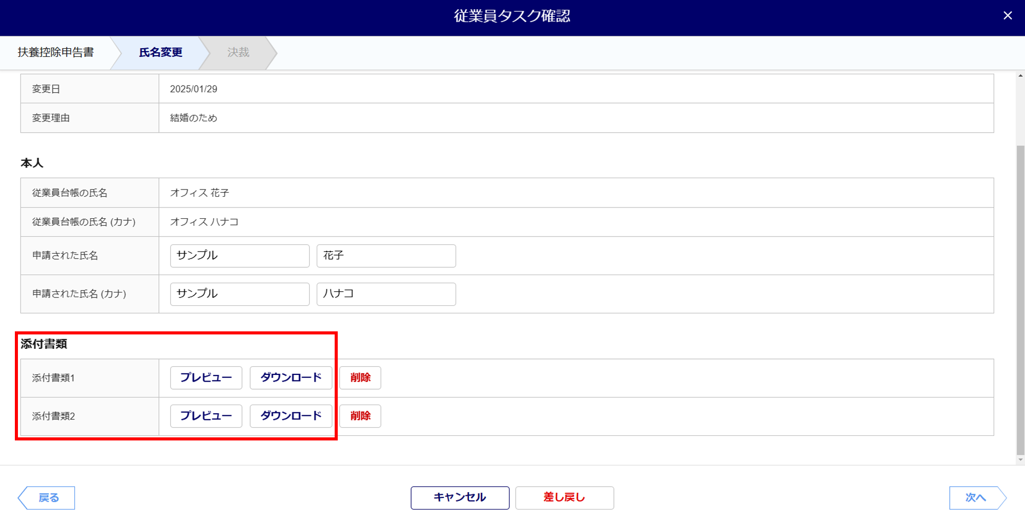 情報を順に確認し、「添付書類」項目の[プレビュー]もしくは[ダウンロード]をクリックすると、添付書類を確認することができます。