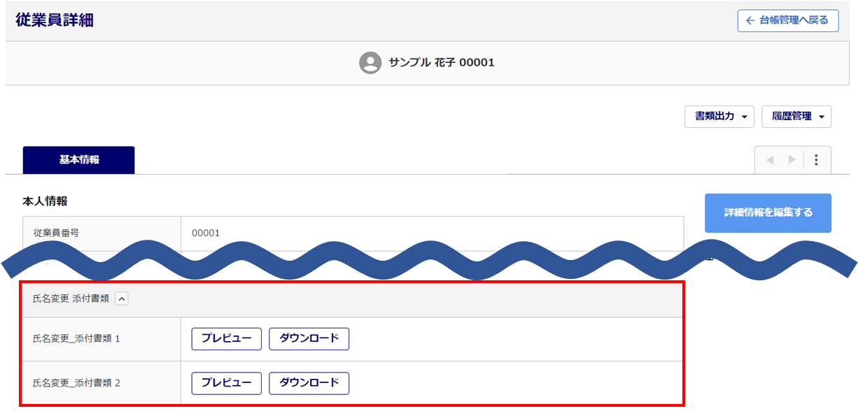 [マスタ管理]>[マイページ管理]>[マイページ設定]にて、「提出書類の台帳保存」に「台帳へ保存する」と設定している場合は、決裁時(または従業員台帳への反映日)に従業員台帳へ添付書類が反映されます。