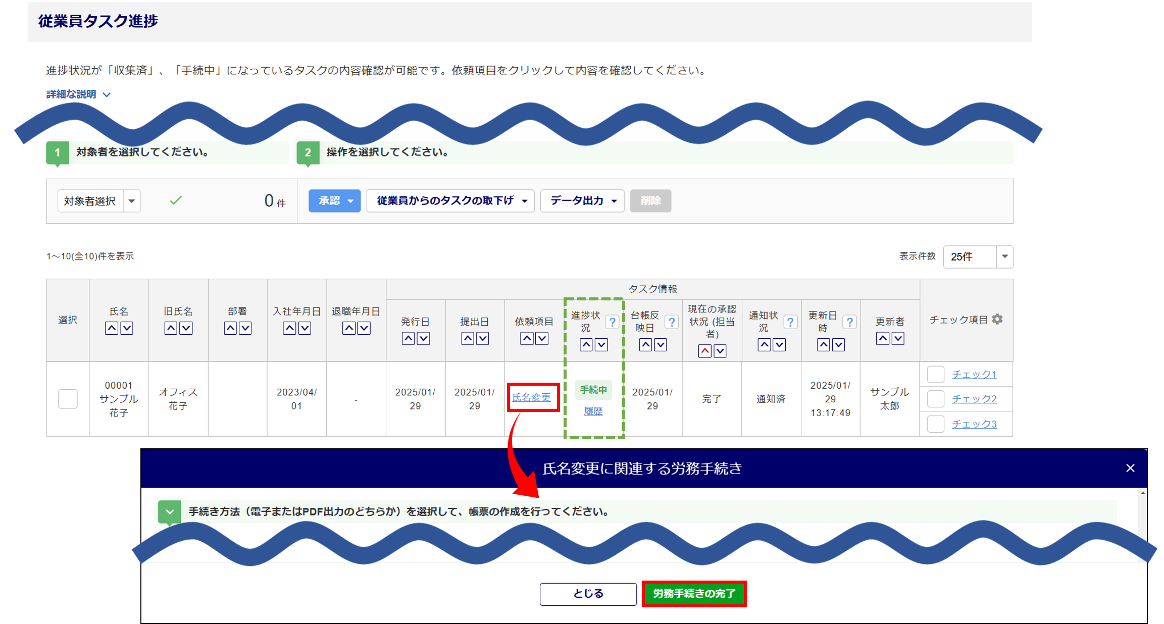 「進捗状況:手続中」の場合は、「依頼項目:タスク名」>[労務手続きの完了]をクリックします。