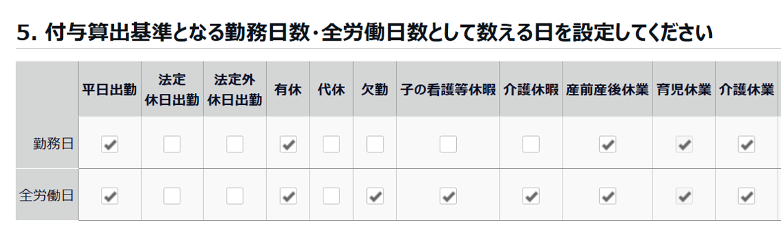 5. 付与算出基準となる勤務日数・全労働日数として数える日を設定してください