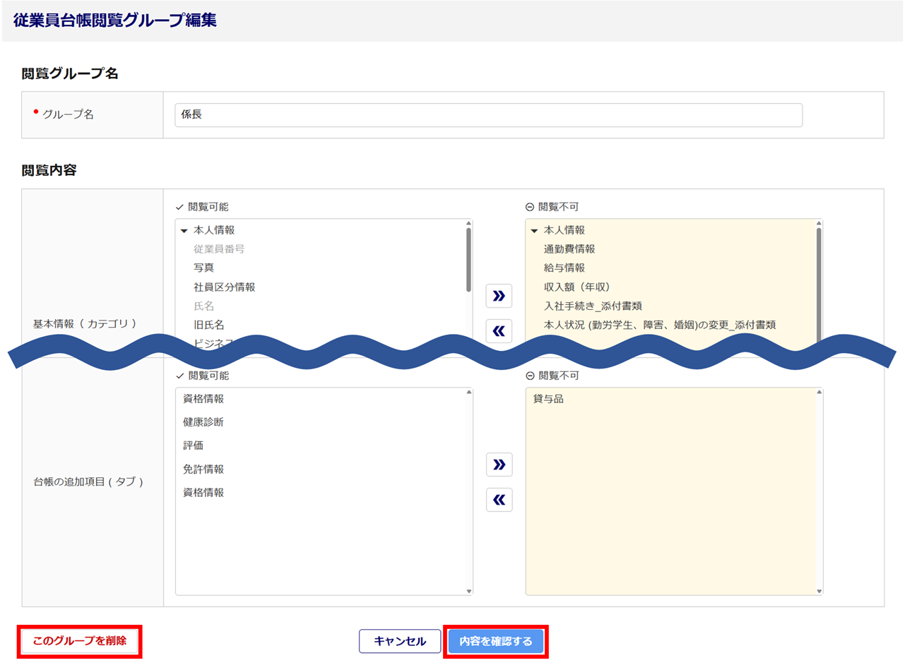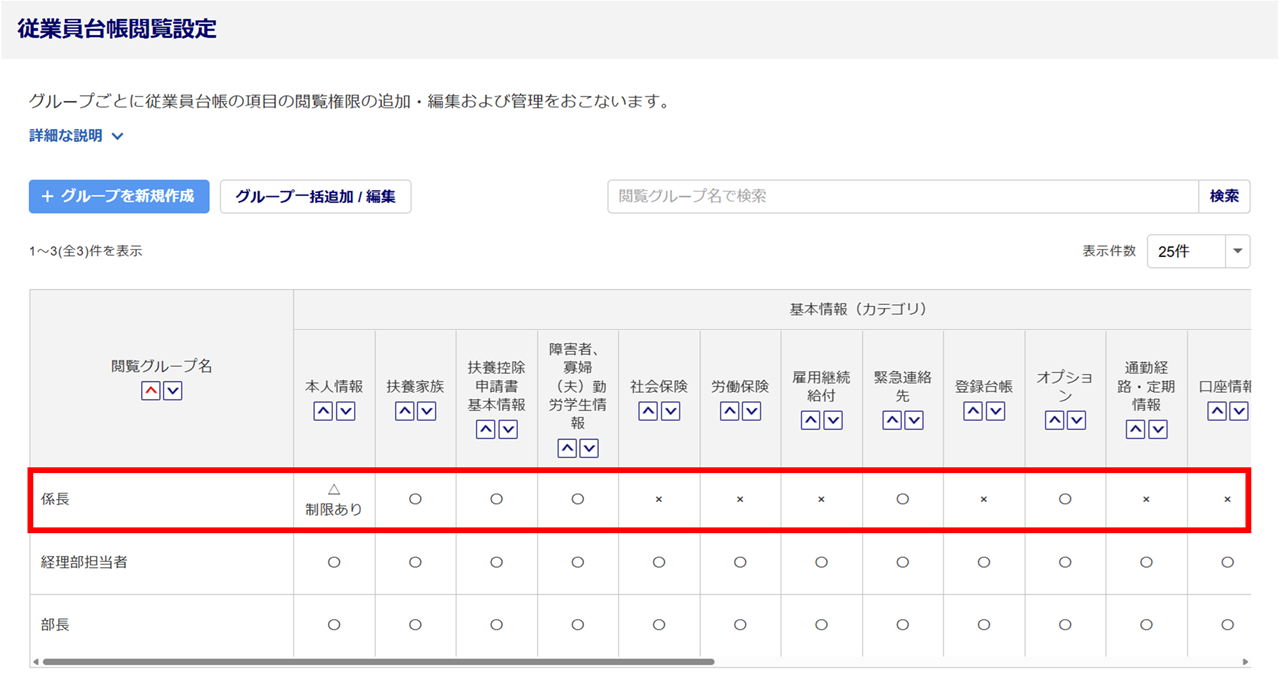 対象の閲覧グループを「利用者管理」の「従業員台帳の閲覧制限」に設定している場合は、閲覧制限が解除されますので、ご留意ください。