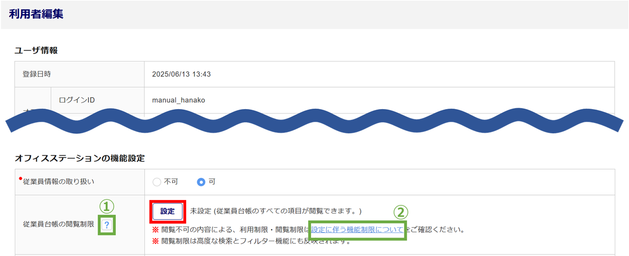[?(はてなマーク)](①)をクリックすると、従業員台帳の閲覧制限の設定についての詳細を確認できます。