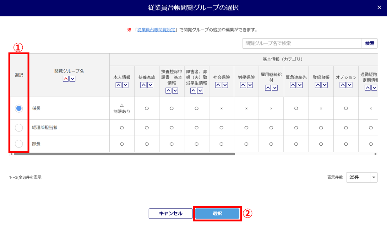 「従業員台帳閲覧グループの選択」画面が開きます。