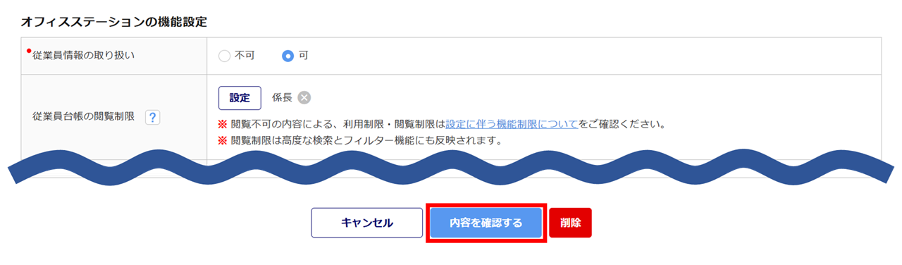 「オフィスステーションの機能設定」カテゴリ内「従業員台帳の閲覧制限」の[設定]をクリックします。