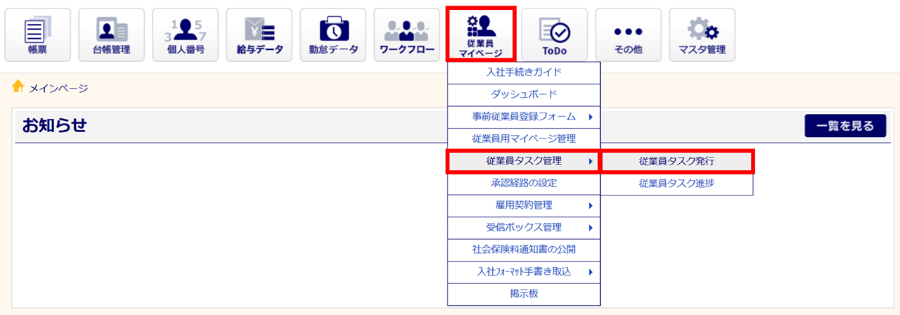 [従業員マイページ]>[従業員タスク管理]>[従業員タスク発行]をクリックします。