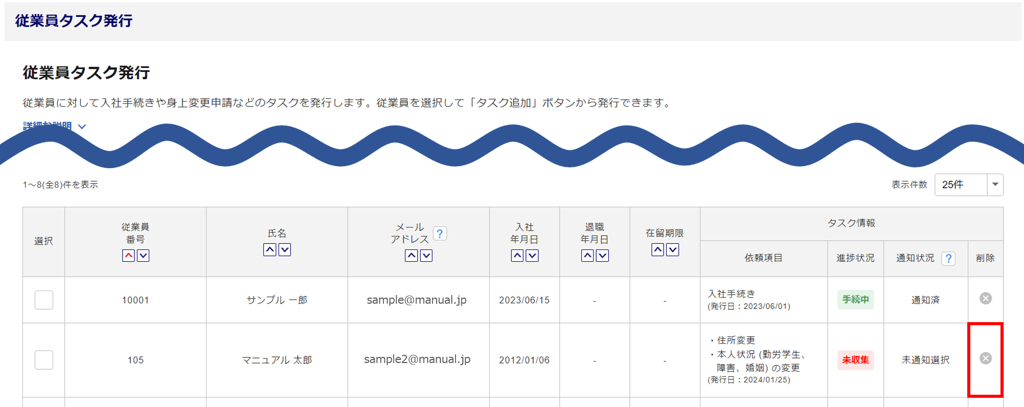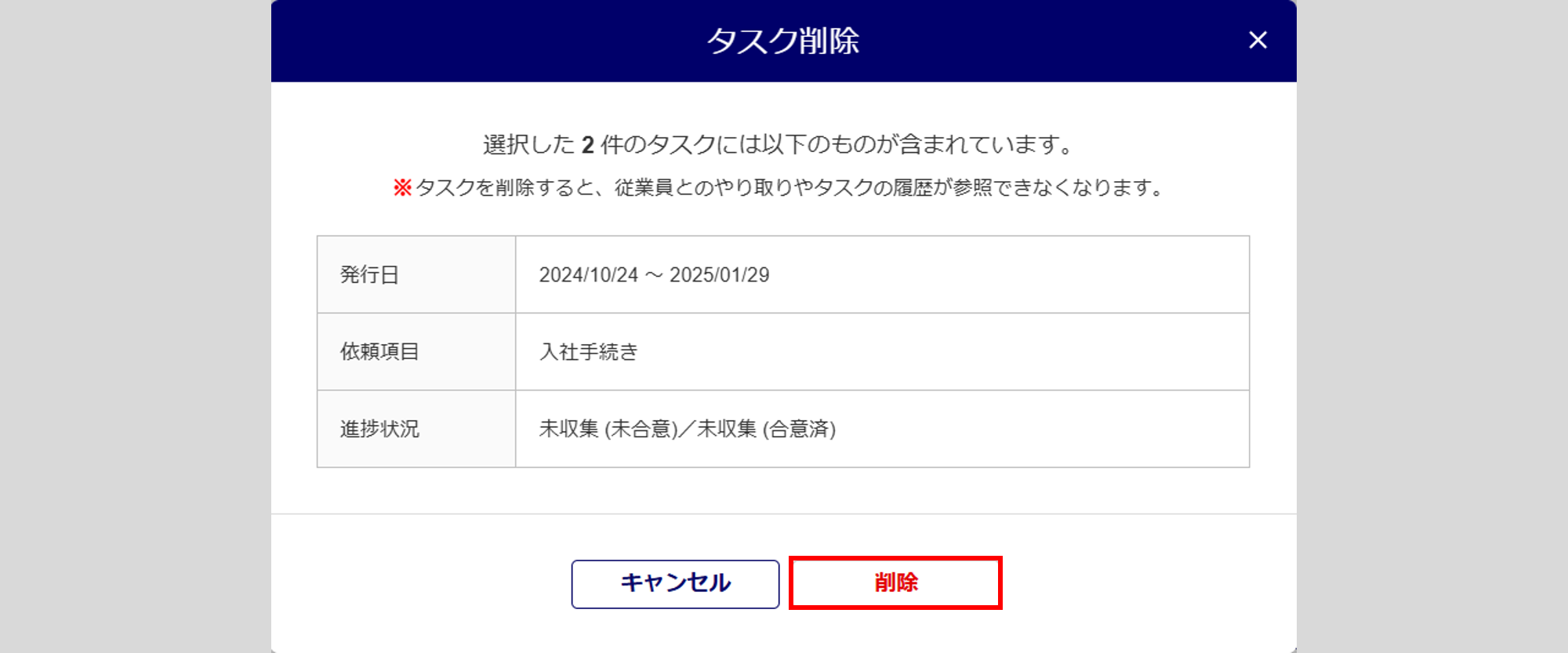 入社手続きタスクなどの「従業員タスク発行」画面から発行したタスクの削除方法についてご説明します。