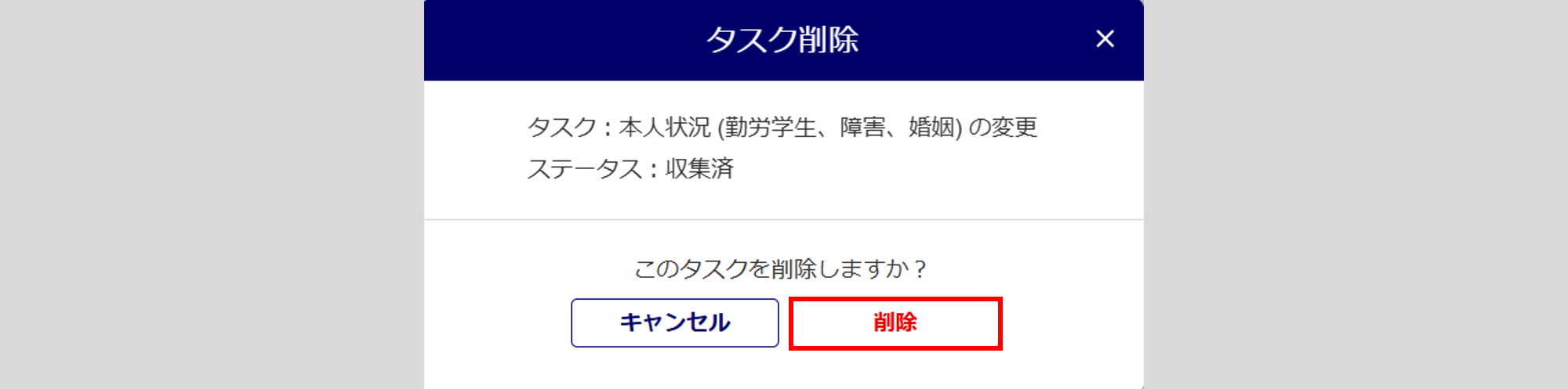 「タスク削除」画面に表示される内容を確認し、問題なければ[削除]をクリックします。