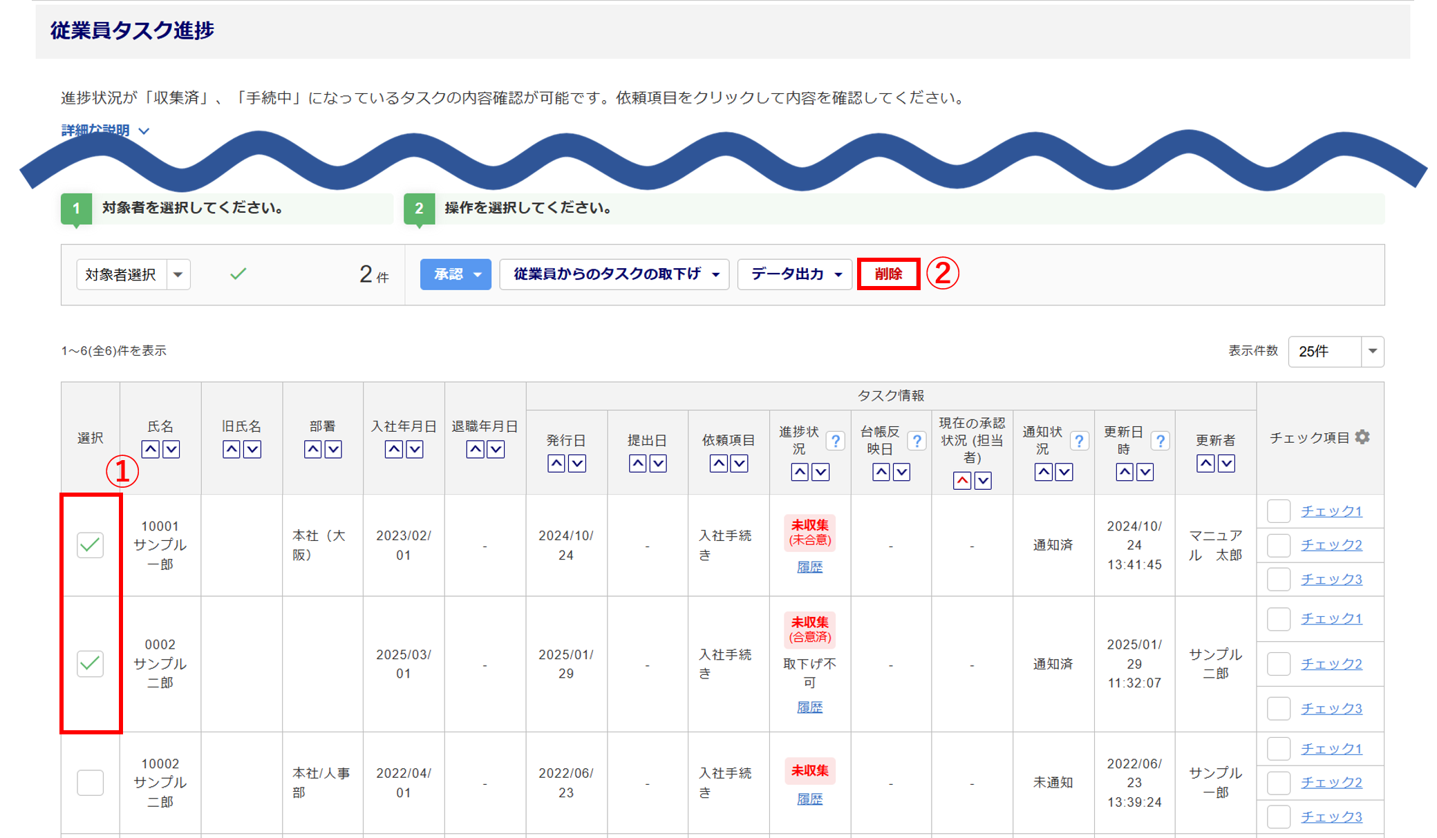 対象タスクの「選択」列(①)にチェックし、[削除](②)をクリックします。
