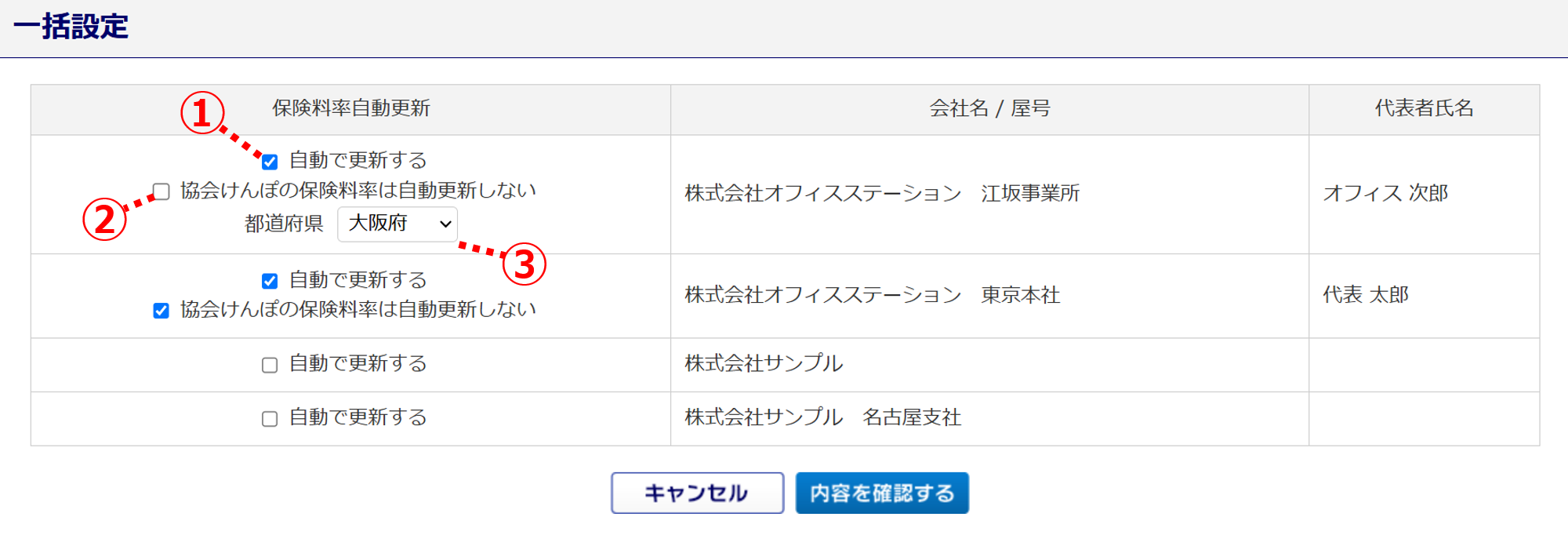 No. 項目 説明 ① 二以上事業所勤務者 「該当する」にチェックします。 ② 個別保険料率を設定 ( 主に非選択事業所 ) 選択します。 ③ 協会けんぽの保険料率を自動更新する チェックします。 ④ 都道府県 都道府県を選択します。