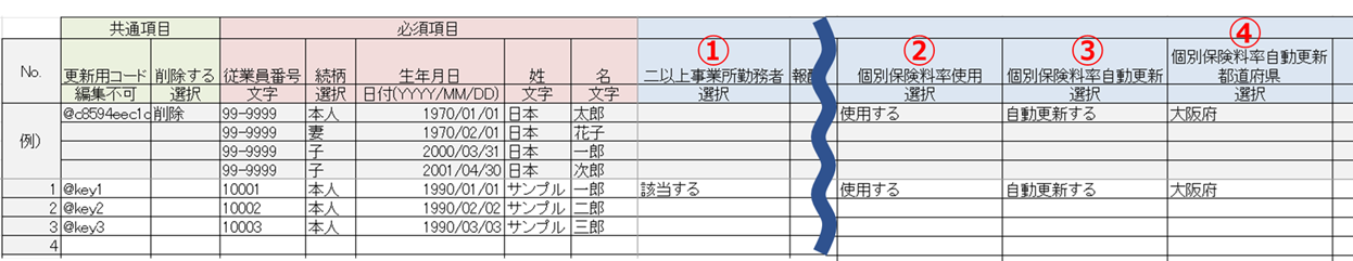 No. 項目 説明 ① 二以上事業所勤務者 「該当する」を選択します。 ② 個別保険料率使用 「使用する」を選択します。 ③ 個別保険料率自動更新 「自動更新する」を選択します。 ④ 個別保険料率自動更新都道府県 都道府県を選択します。