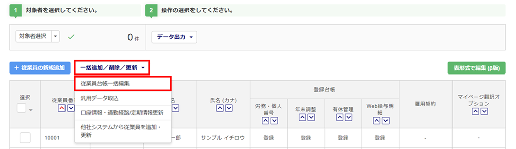 [一括追加/削除/更新]>[従業員台帳一括編集]をクリックします。