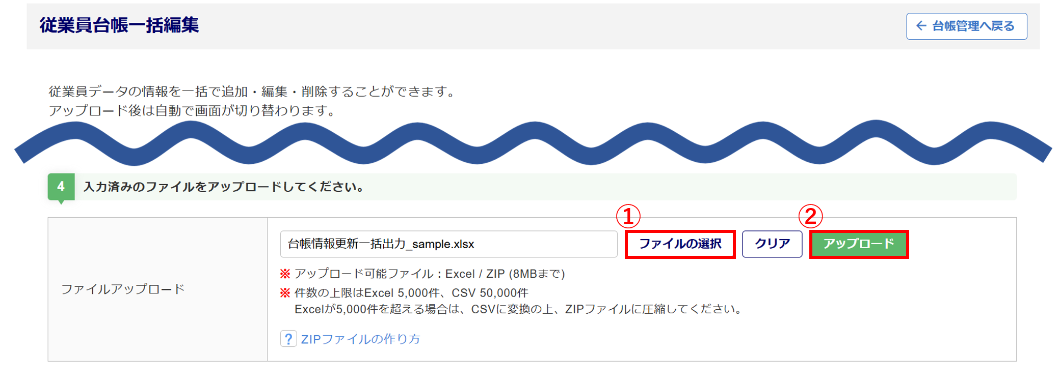 [ファイルの選択](①)をクリックし、先ほど保存したファイルを選択、[アップロード](②)をクリックします。