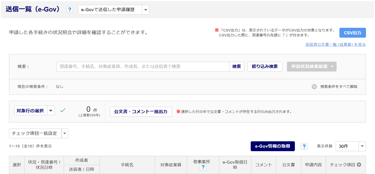 [送信一覧]>[e-Gov]もしくは[マイナポータル]をクリックします。
