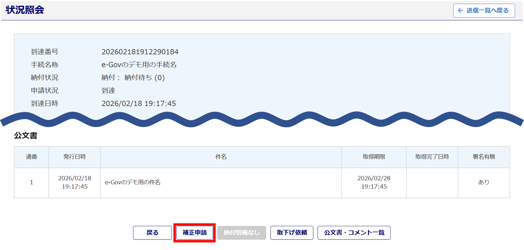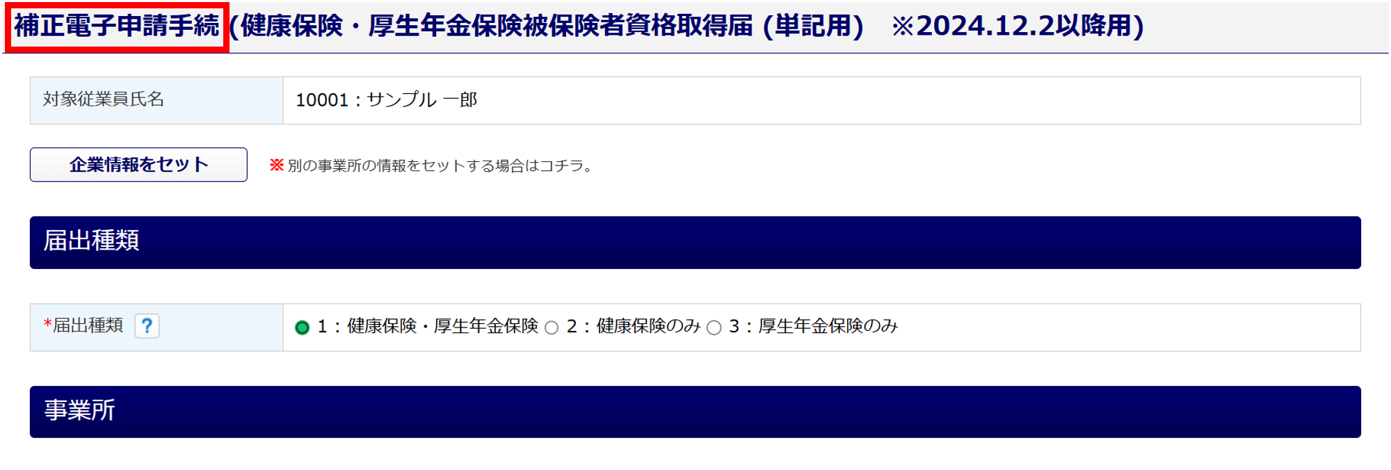 「補正電子申請手続」画面にて、対象の項目の情報を修正し、申請をおこないます。